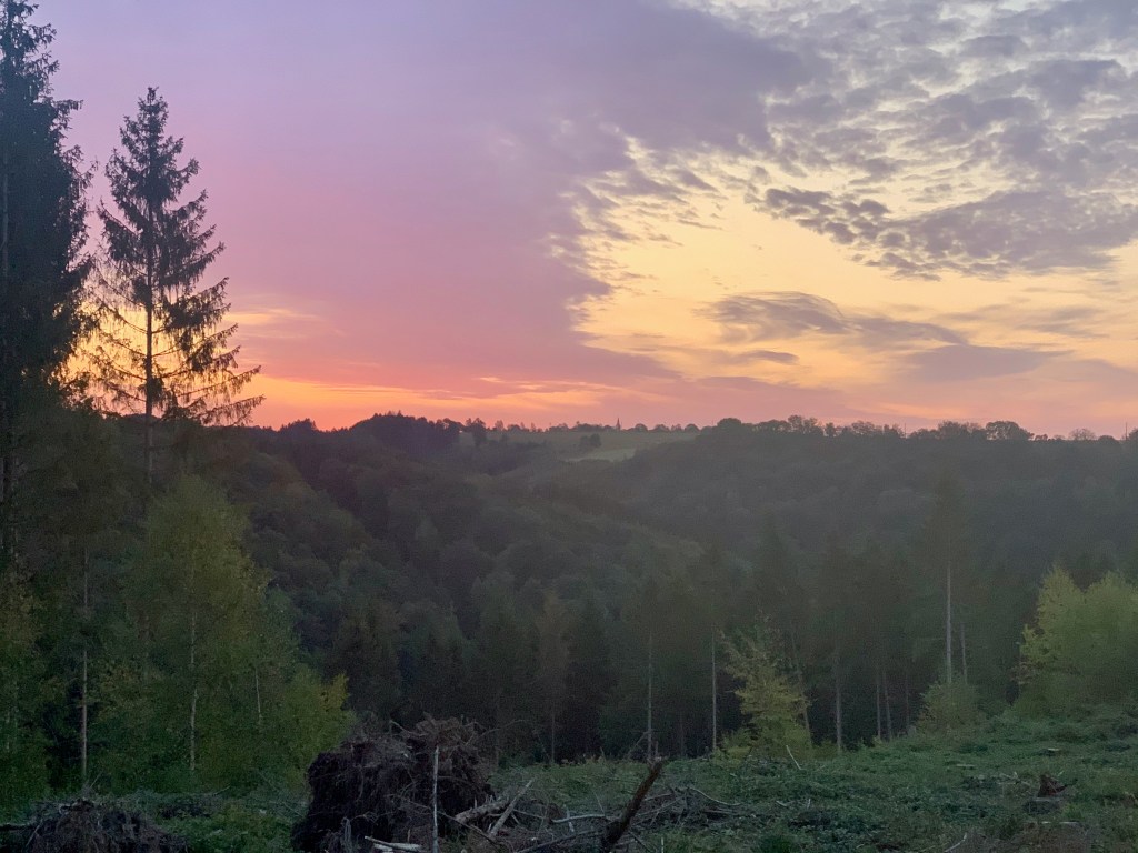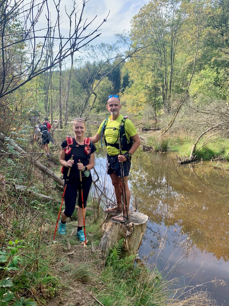 Ik was mentaal voorbereid op de Hérou, wat geslinger aan kettingen, kronkelende paadjes langs de immens laag staande Ourthe, een paar trappen,… Maar hij hakte er toch in, die Hérou. Zijn naam niet gestolen. Mijn eerste bevestiging dat ik conditioneel niet genoeg getraind was voor de hellingen van de Ourthe Supérieure… Maar opgeven was geen optie, toch dan nog niet. Even de mind-set bijstellen, er volgden immers nog wat van die hellingen… Als eerste Le Cheslé, omhoog naar overblijfselen van een versterkte vestiging uit de Ijzertijd. Na nog wat gestaag klimwerk, eindelijk de afdaling naar Maboge, mijn eerste rust CP. Dat dacht ik toch… maar dan was er Sander. Die elke meter van het parcours blindelings kent. Handig. Alleen heel confronterend als de boodschap luidt : “Hier moeten we nog bergop voor we aan de CP zijn. Niet ver hoor, maar wel effe steil.” Nee, nee, nee, hier had ik echt geen goesting in. Mijn niet-zagen-schild kreeg een eerste barstje. Gelukkig was het echt niet ver en lonkte de rust…