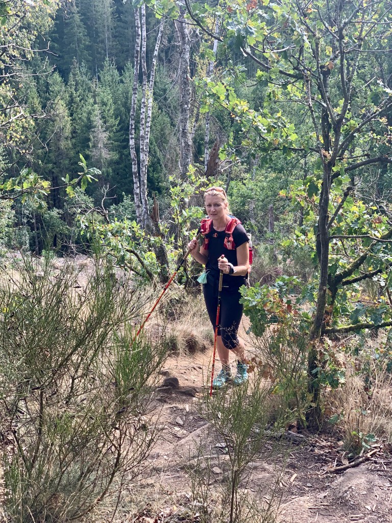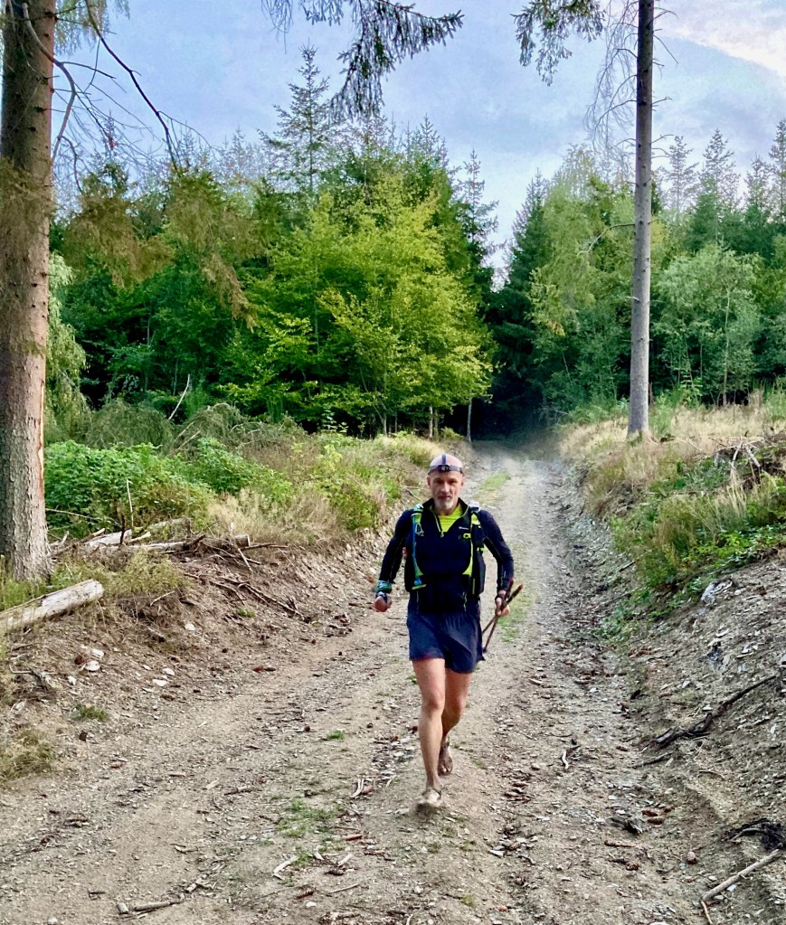 Na Samrée wachtte me nog gekend terrein. Ietwat schoorvoetend, want ik wist dat er een paar kuitenbijters aankwamen. Maar een volgende verrassing van de goden kondigde zich aan en maakte ons even euforisch. Een omleiding, zeg maar een short cut. Wat nog niet goed doordrong bij de start (“De gele Legends pijlen overrulen alles, ook de .gpx”) kwam dan als een bom binnen. Maar wat een bommeke… Wat het ten voordele van de jacht, wegens natuurbehoud of gewoon een beslissing van de organisatie? Who cares, dit was een cadeau! Dus de swung zat er terug in, dan maar verder naar beneden. Of was het naar boven? Mijn orakel had me voorspeld dat ‘Jezus aan het Kruis’ een ijkpunt was, tot daar doorbijten en erna gemakkelijk bergaf naar de volgende CP. Merci Jezus!