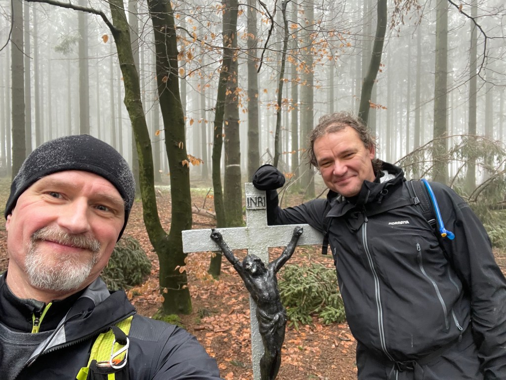Sander heeft een mooi toerke uitgestippeld. We vertrekken in een mistig en kil landschap. Maar het is zo lang geleden dat we mekaar gezien hebben dat onzen bebber geen twee minuten stilstaat. Er wordt eigenlijk meer gebabbeld dan gelopen.
